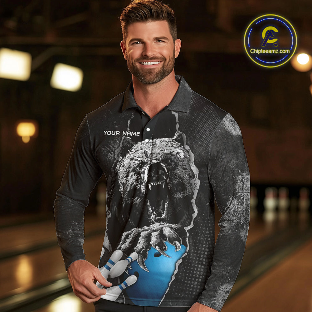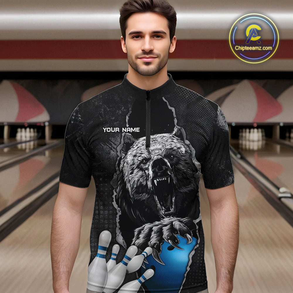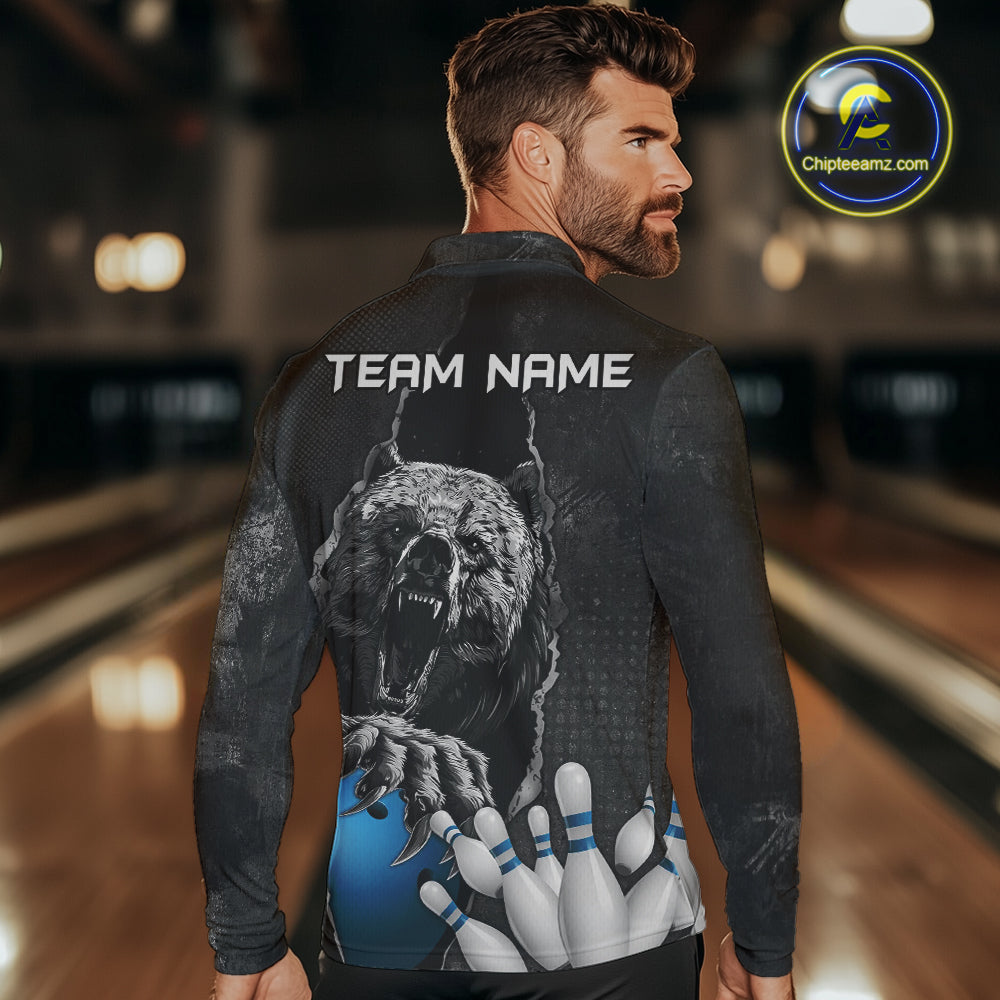 Blue and Black Bear grunge Custom Men Bowling Polo, Quarter Zip Shirts Bowling Team Jerseys Outfits NQS10166