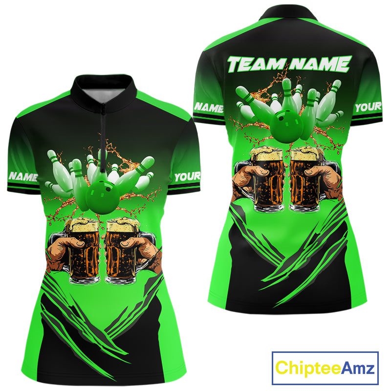 Bowling Beer Black and Green Bowling Polo, 1/4 Quarter zip shirts Custom Women Team Bowling jerseys NQS10874