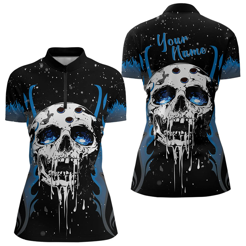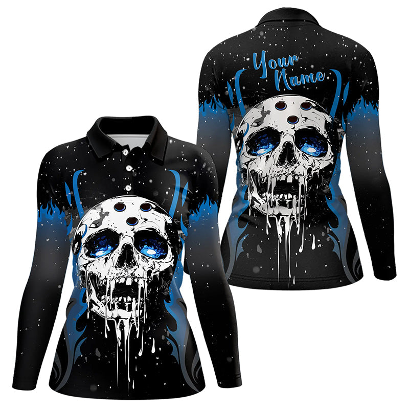 Custom Black and Blue Flame Galaxy Skull Bowling Shirts for Women, Skull Bowling Team Shirts Uniform NQS9622