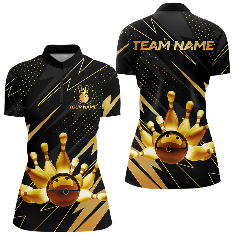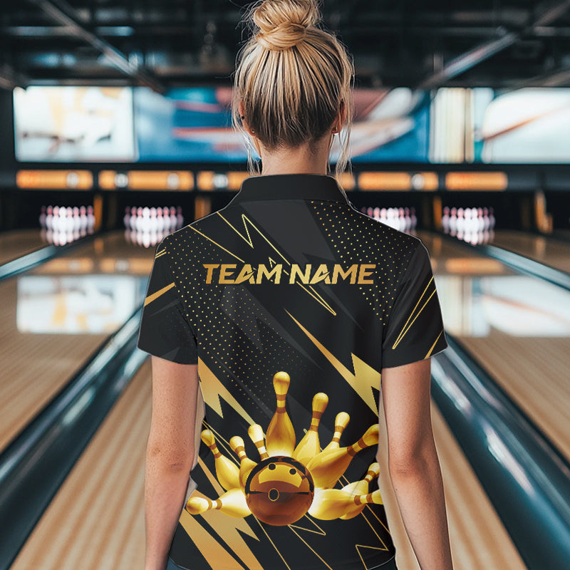 Custom Black and Gold Bowling Polo, Quarter Zip Shirts for Women, Team Bowling League Jersey NQS9682
