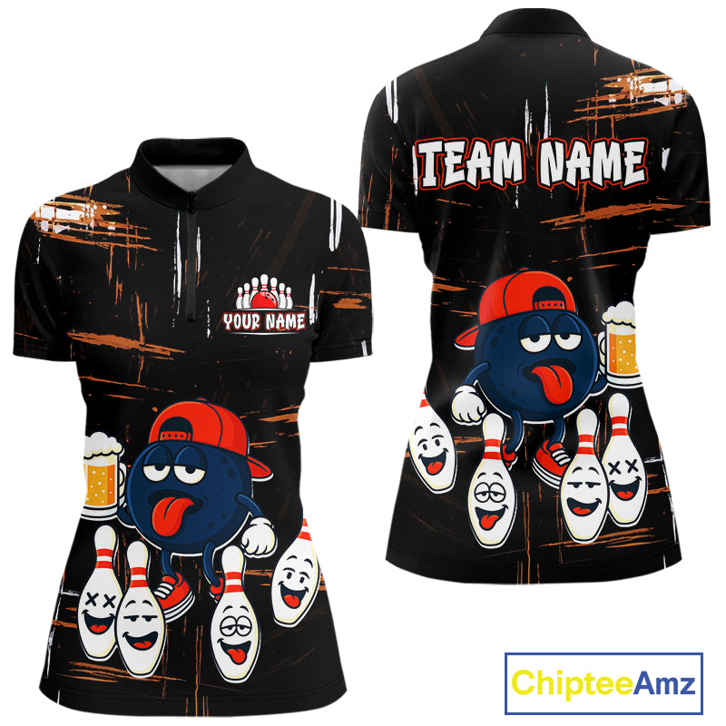 Custom Black And Orange Funny Beer Bowling Women Polo, Quarter Zip Shirts, funny bowling shirts NQS10959