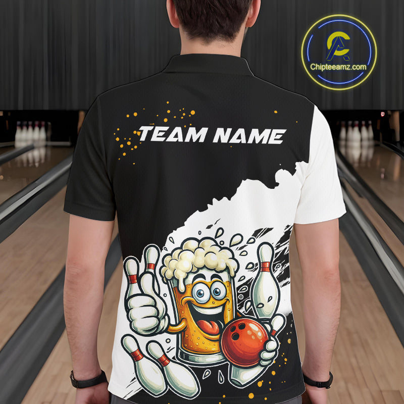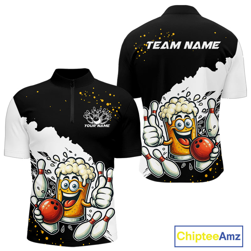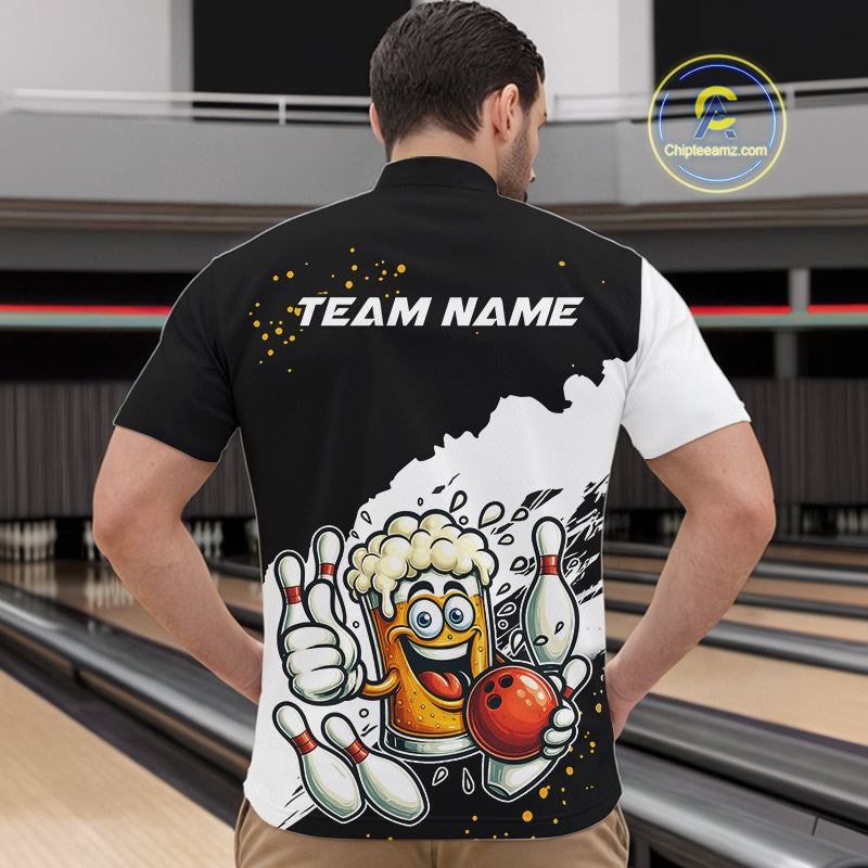 Funny Beer Glass Black and White Bowling Polo, 1/4 Zip Shirts for Men Custom Bowling Team Jersey NQS10933