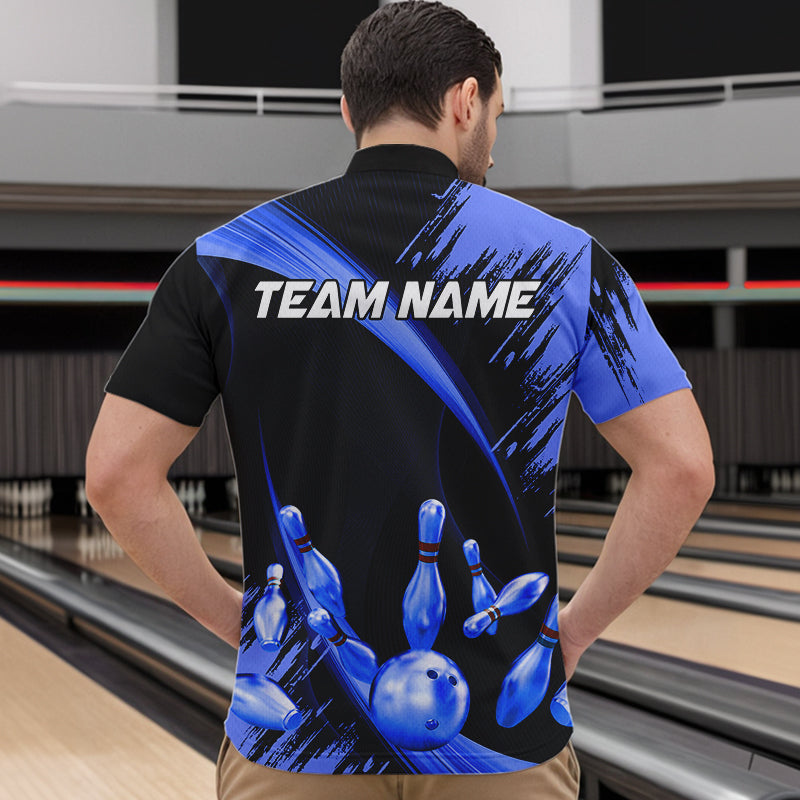 Personalized Black and Blue Bowling Polo, Quarter Zip Shirts For Mens Custom Bowling Team Jersey NQS9723