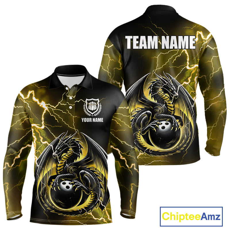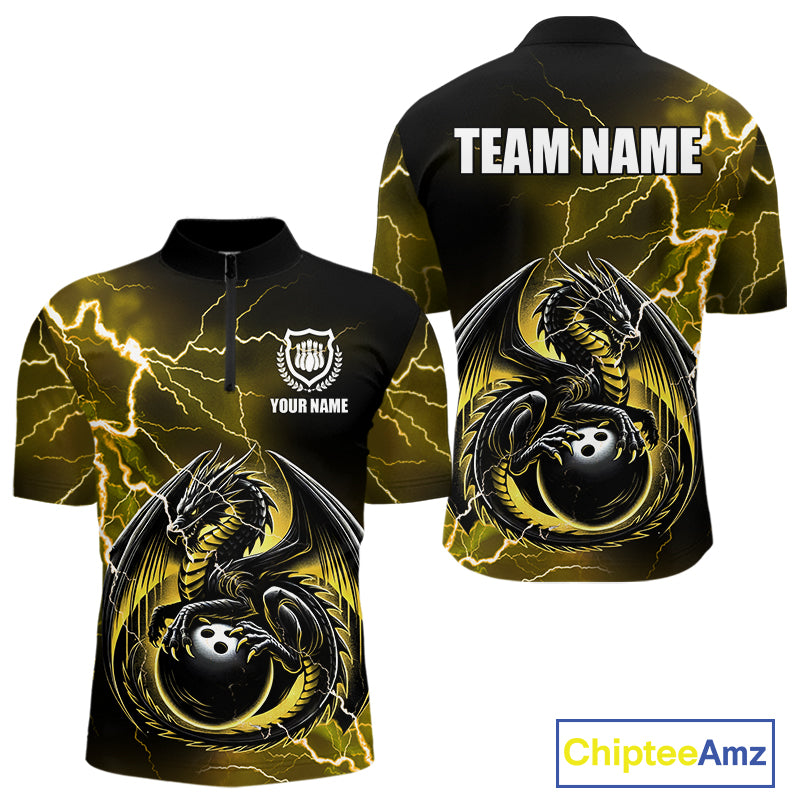 Personalized Black And Yellow Thunder Lightning Dragon Bowling Shirts For Men, Bowling Team Uniform NQS10297