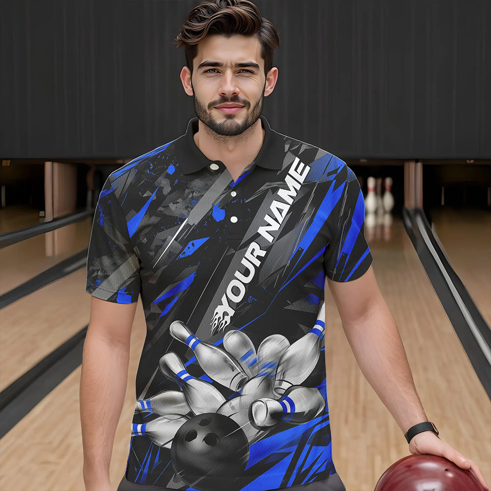 Custom Black And Blue Bowling Polo Shirts For Men, Bowling Tournament Team Uniform IPHW8528