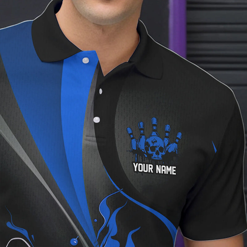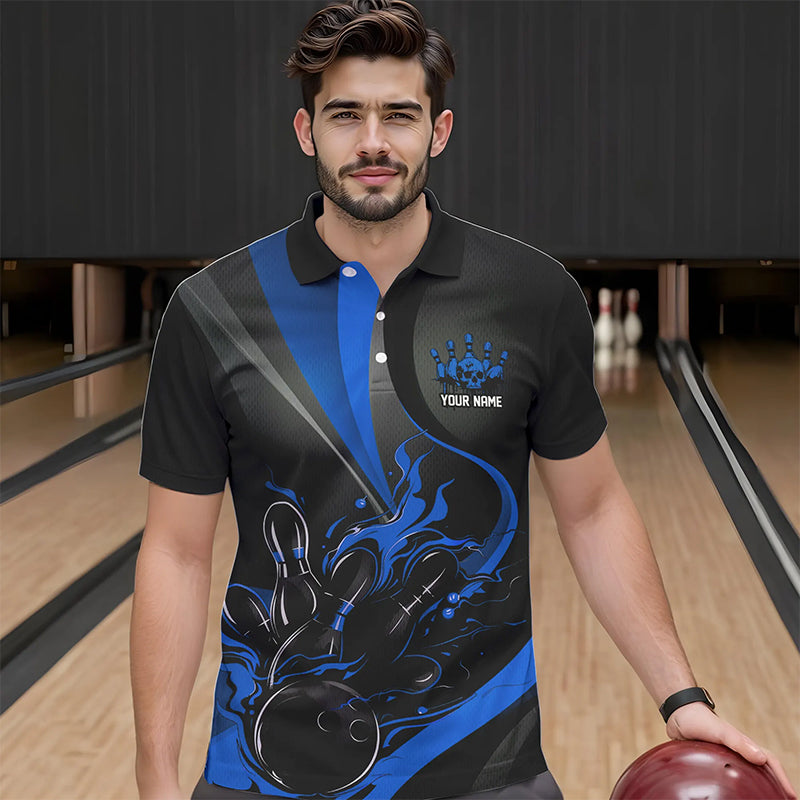 Custom Black And Blue Flame Bowling Polo Shirts For Men, Fire Bowling Team Shirt IPHW8542