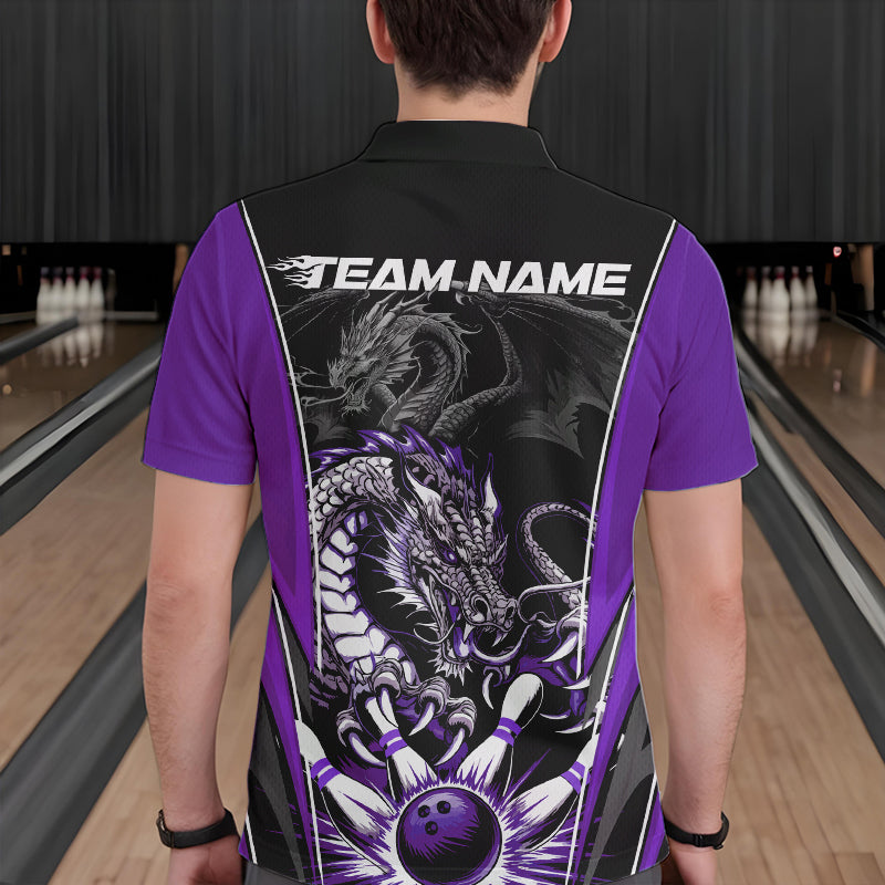 Custom Black And Purple Dragon Bowling Polo Shirts For Men, Dragon Bowling Tournament Uniform IPHW8554