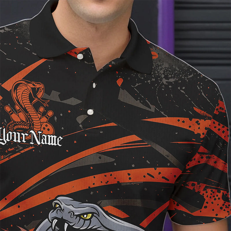 Custom Black And Orange Cobra Snake Bowling Team Polo Shirts For Men, Bowling League Shirts IPHW8567