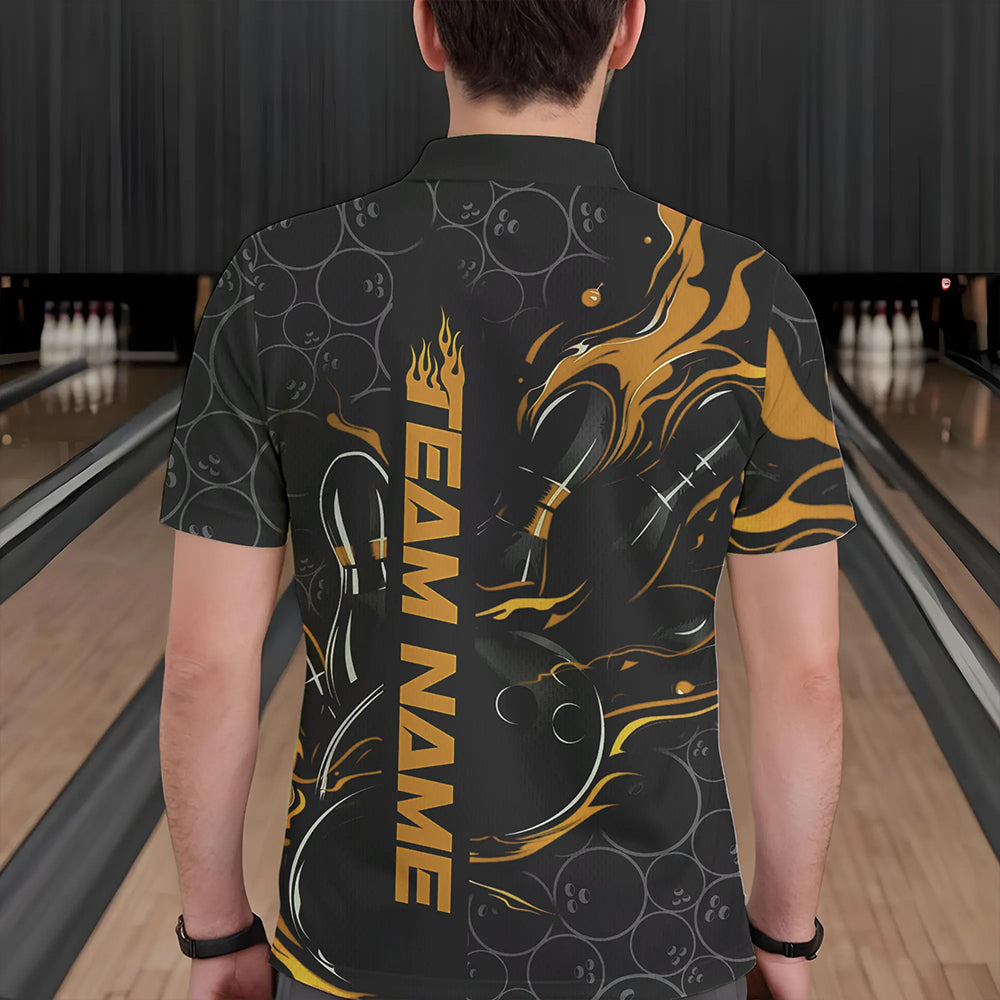 Custom Black And Gold Flame Strike Bowling Team Polo Shirts For Men, Strike Bowling Jerseys IPHW8614