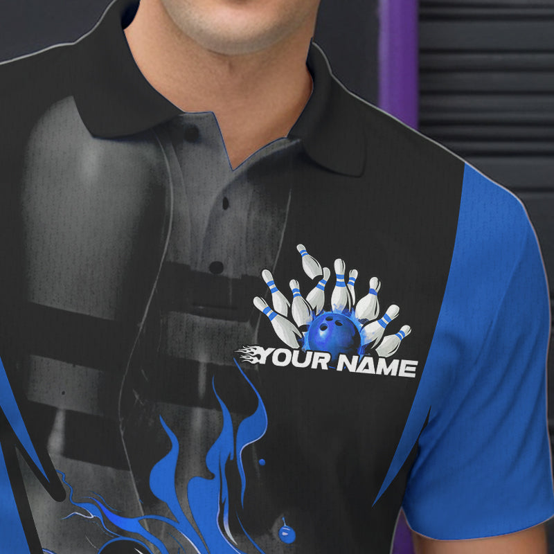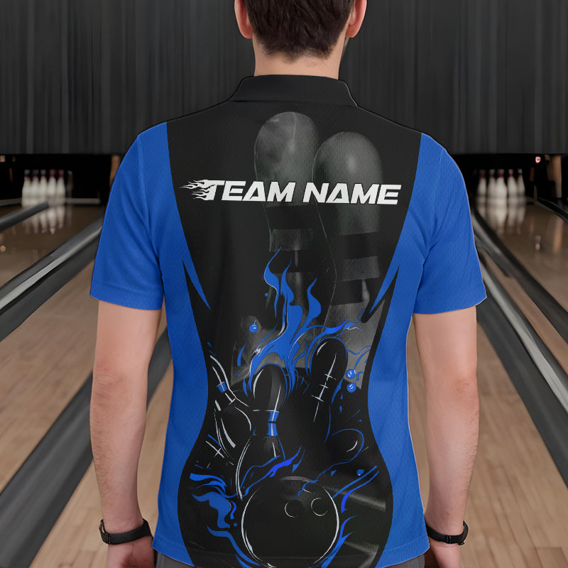 Custom Black And Blue Flame Bowling Polo Shirts For Men, Fire Bowling League Shirt IPHW8620