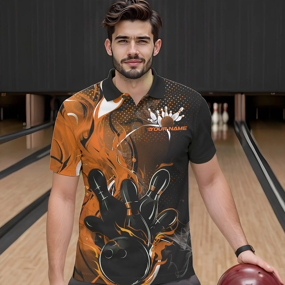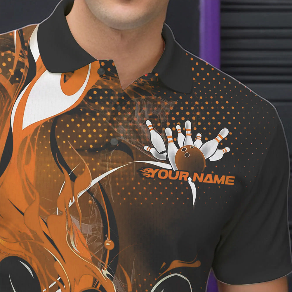 Black And Orange Custom Flame Bowling Polo Shirts For Men, Fire Bowling League Team Shirt IPHW8631