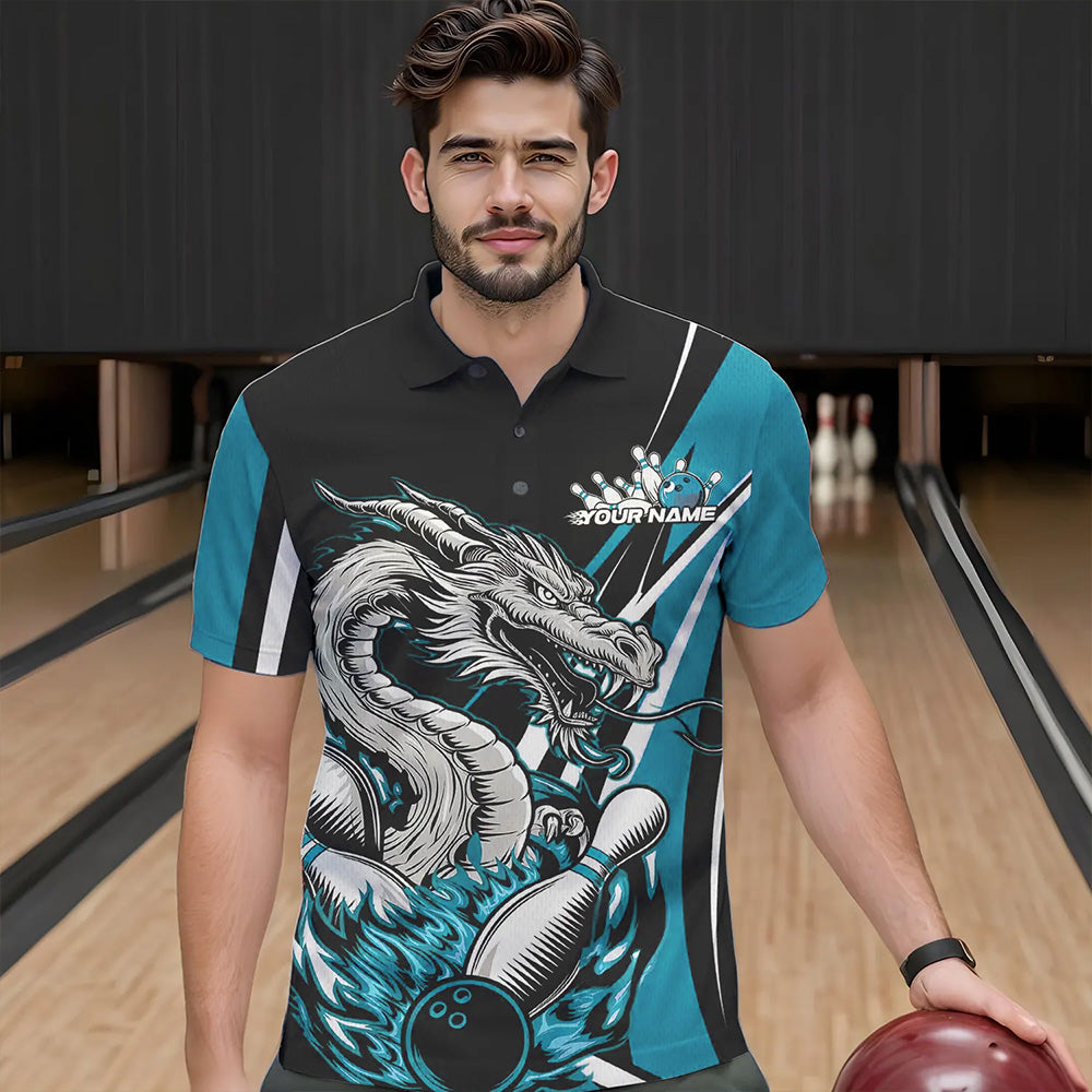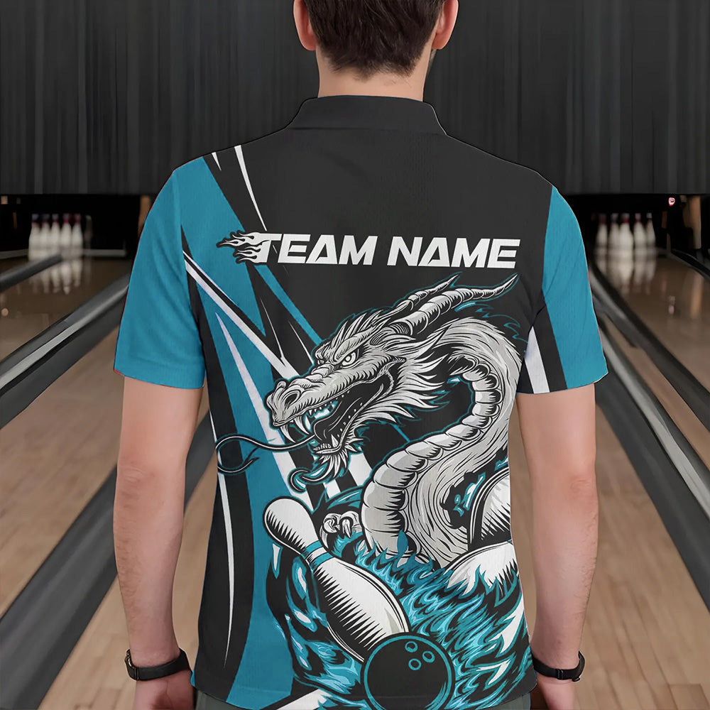 Custom Black And Blue Flame Dragon Bowling Jerseys, Dragon Men Bowling Team Polo Shirts IPHW8712
