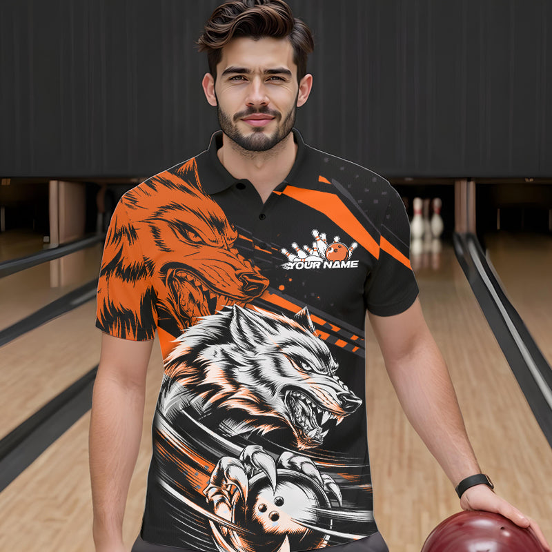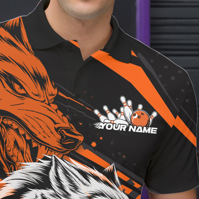 Custom Black And Orange Wolf Bowling Men Polo Shirts, Wolf Bowling League Shirt Team Uniform IPHW8715