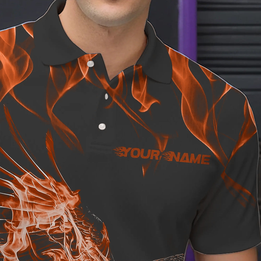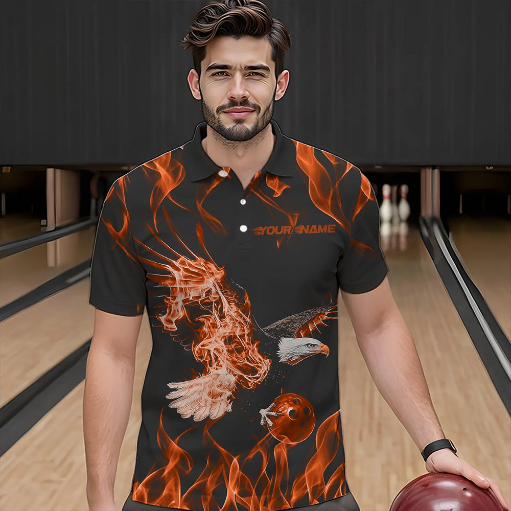 Custom Black And Orange Flame Eagle Bowling Team Men Polo Shirts, Eagle Bowling League Shirt IPHW8792