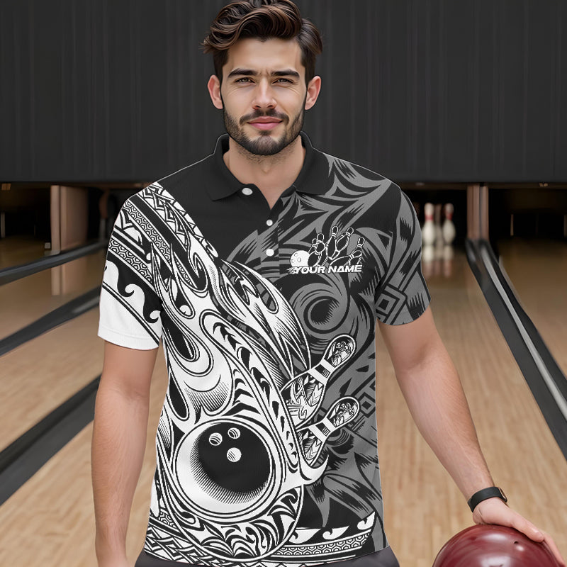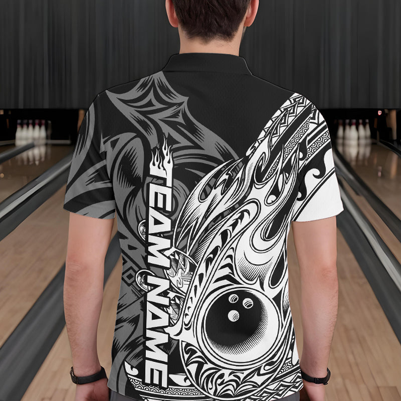 Custom Black And White Flame Tribal Polynesian Bowling Men Polo Shirts, Bowling Team Uniform IPHW8809