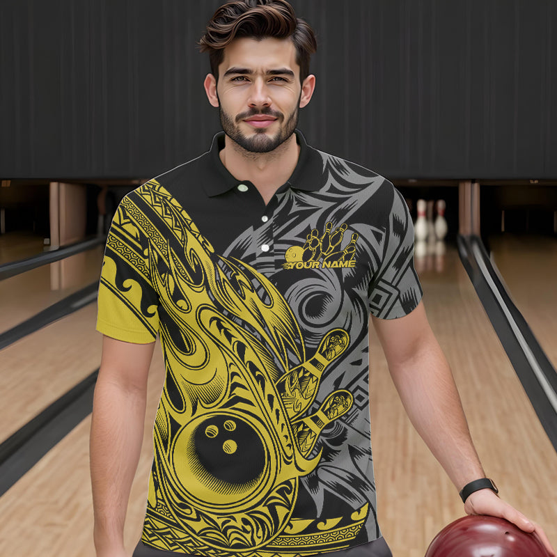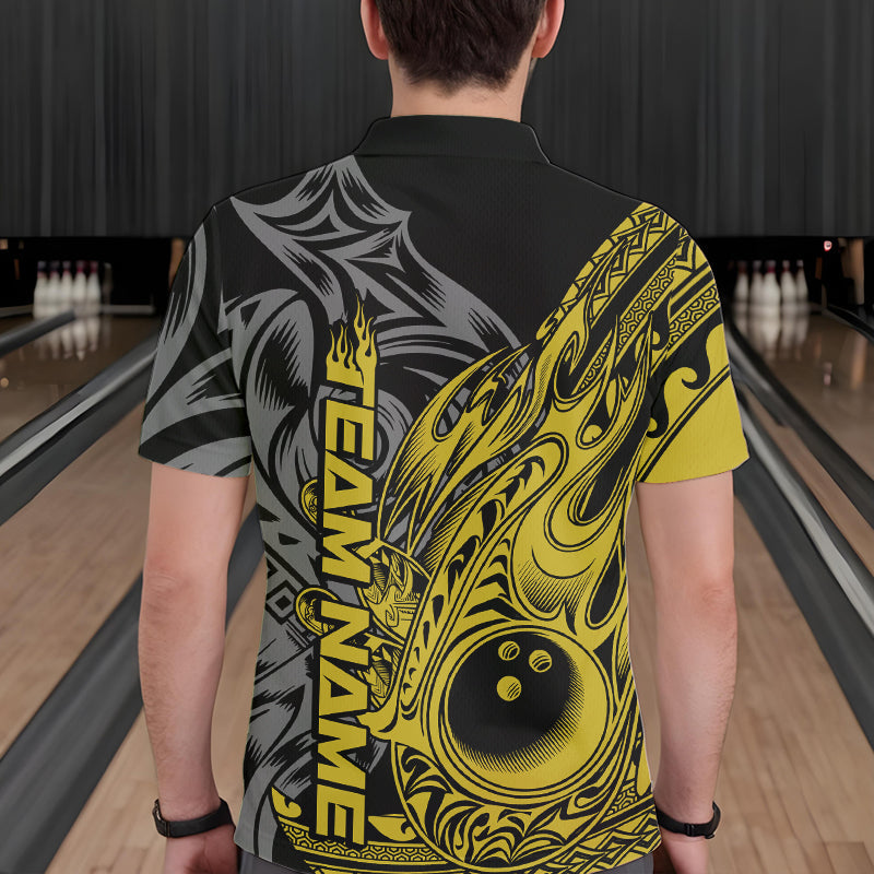 Custom Black And Yellow Flame Tribal Polynesian Bowling Men Polo Shirts, Bowling Team Uniform IPHW8810