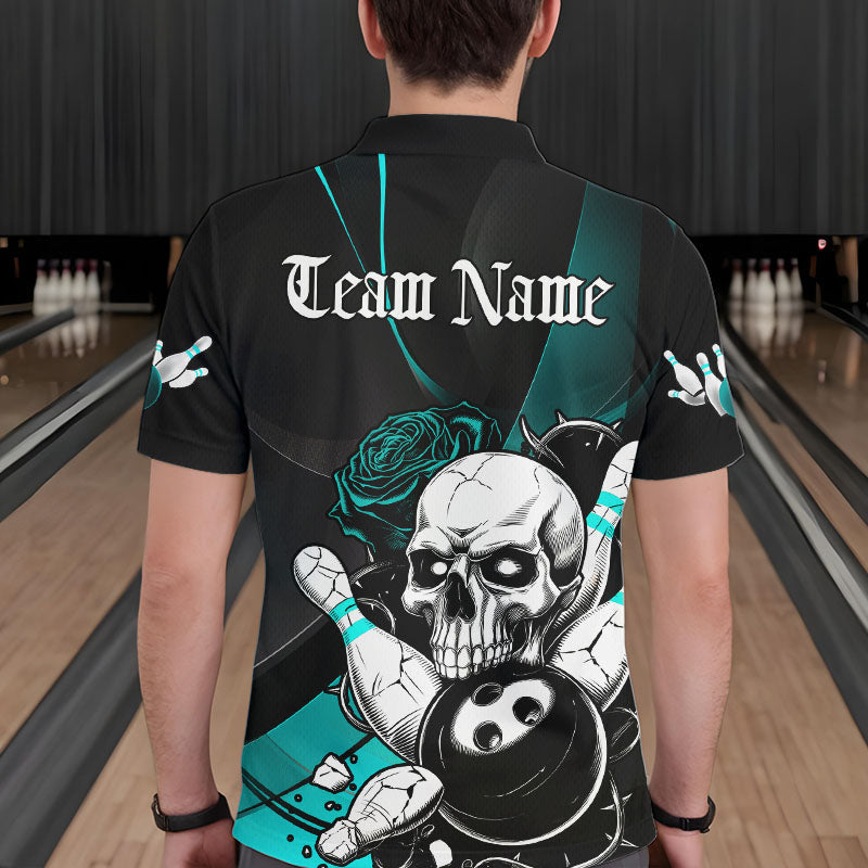 Custom Black And Blue Roses Skull Bowling Team Polo Shirts For Men, Skull Bowling Jerseys IPHW8872