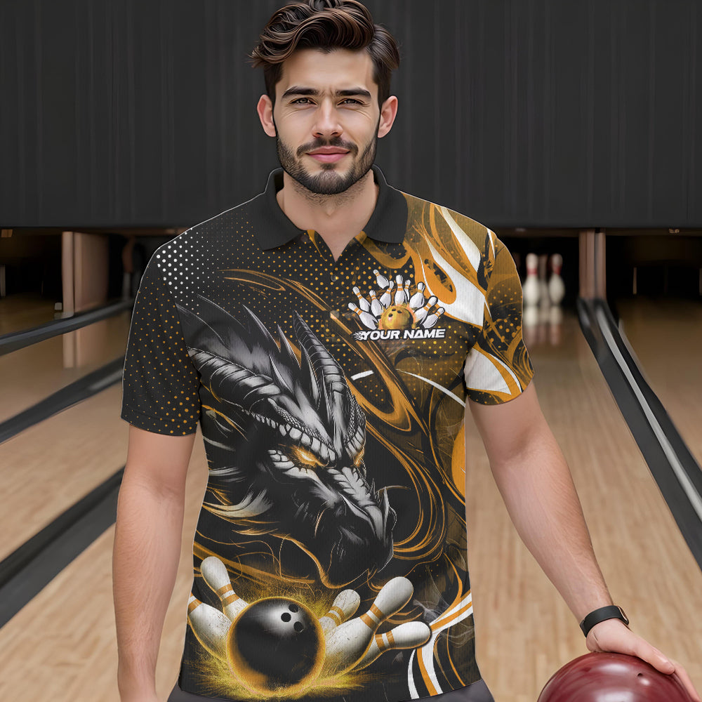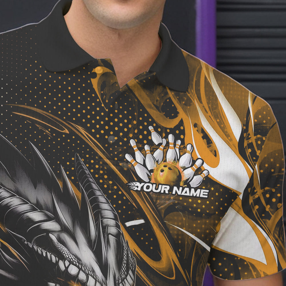 Custom Black And Yellow Flame Dragon Bowling Jerseys, Dragon Bowling Team Men Polo Shirts IPHW8921