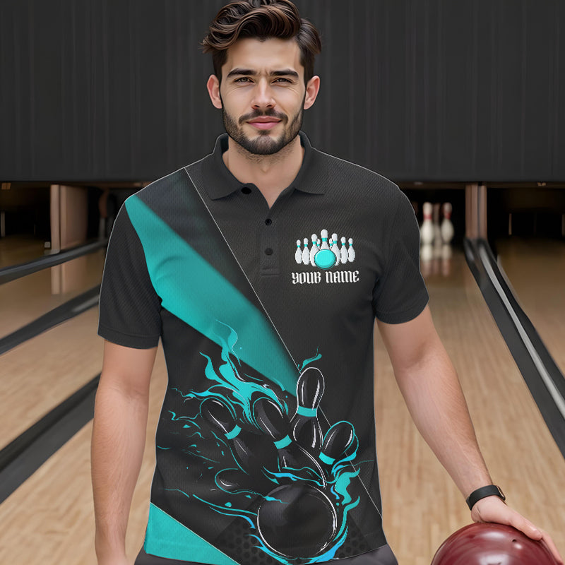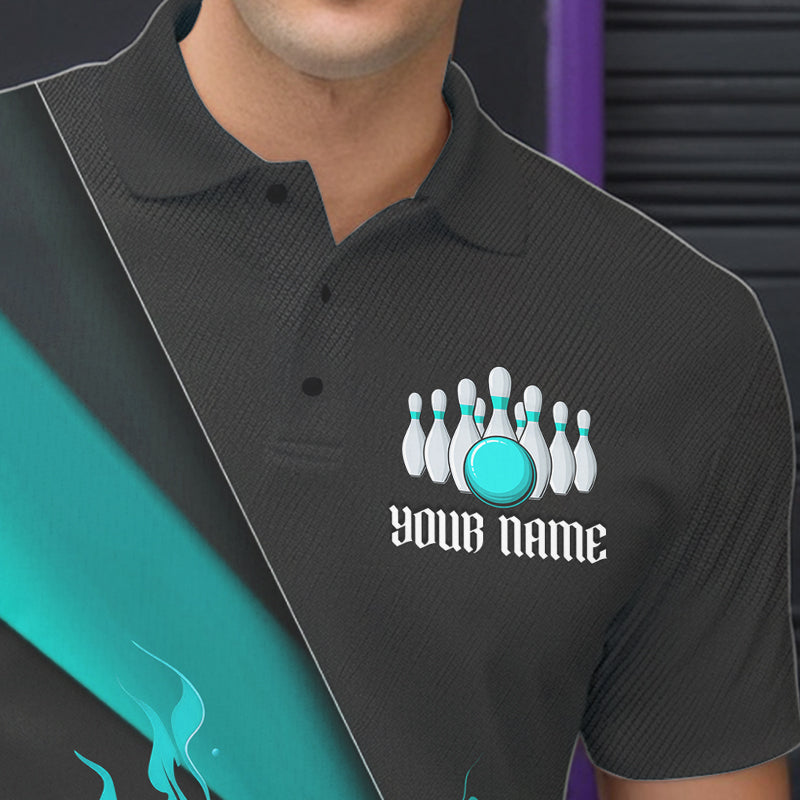 Custom Black And Blue Flame Duckpin Bowling Team Men Polo Shirts, Duckpin Tournament Outfit IPHW8946