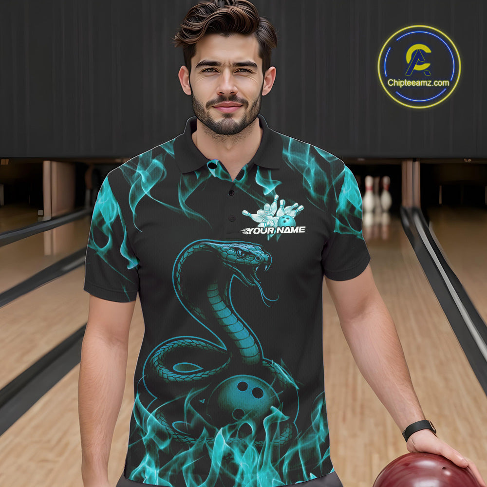 Custom Black And Blue Flame Cobra Snake Bowling Men Polo Shirts, Bowling League Shirt IPHW9042