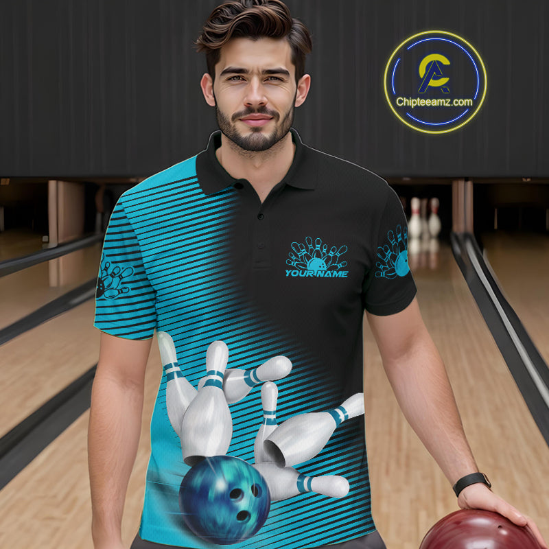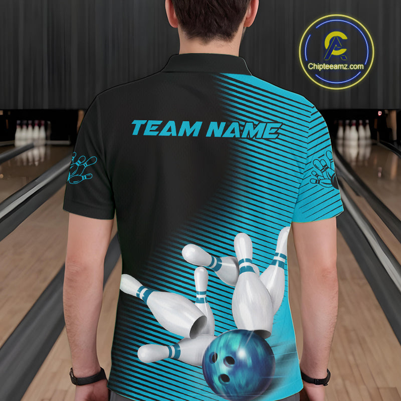 Custom Black And Blue Bowling Polo Shirts For Men, Blue Bowling Jerseys IPHW9401