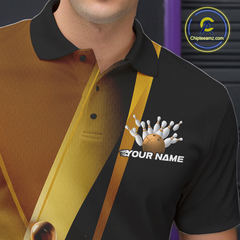 Custom Black And Glowing Gold Bowling Team Men Polo Shirts, Golden Bowling Jerseys IPHW9454