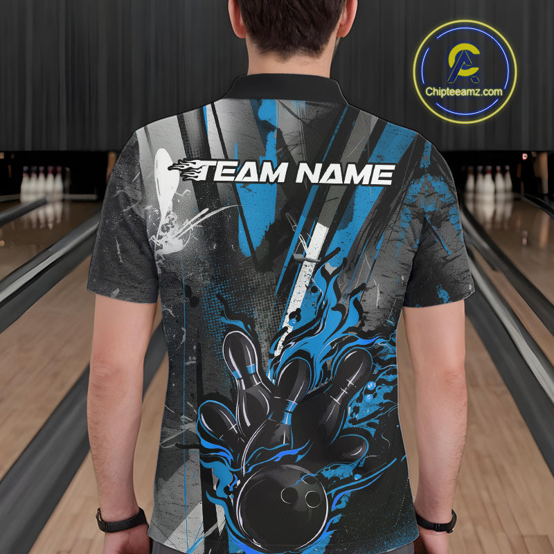 Custom Grunge Black And Blue Fire Flame Bowling Polo Shirts For Men, Bowling Team Uniform IPHW9556
