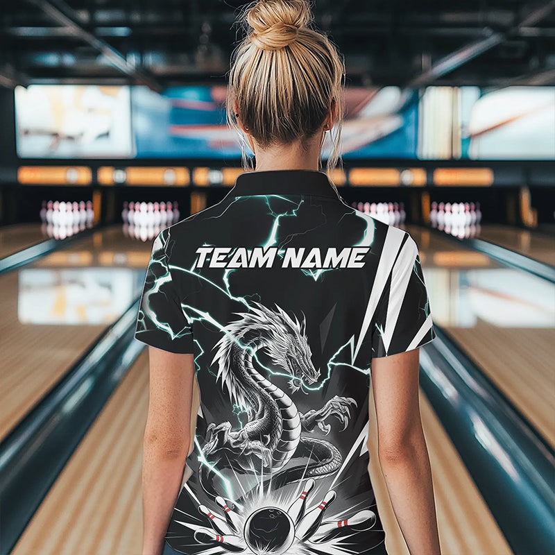 Custom Black And Blue Thunder Lightning Dragon Bowling Team Polo Shirts For Women IPHW8557
