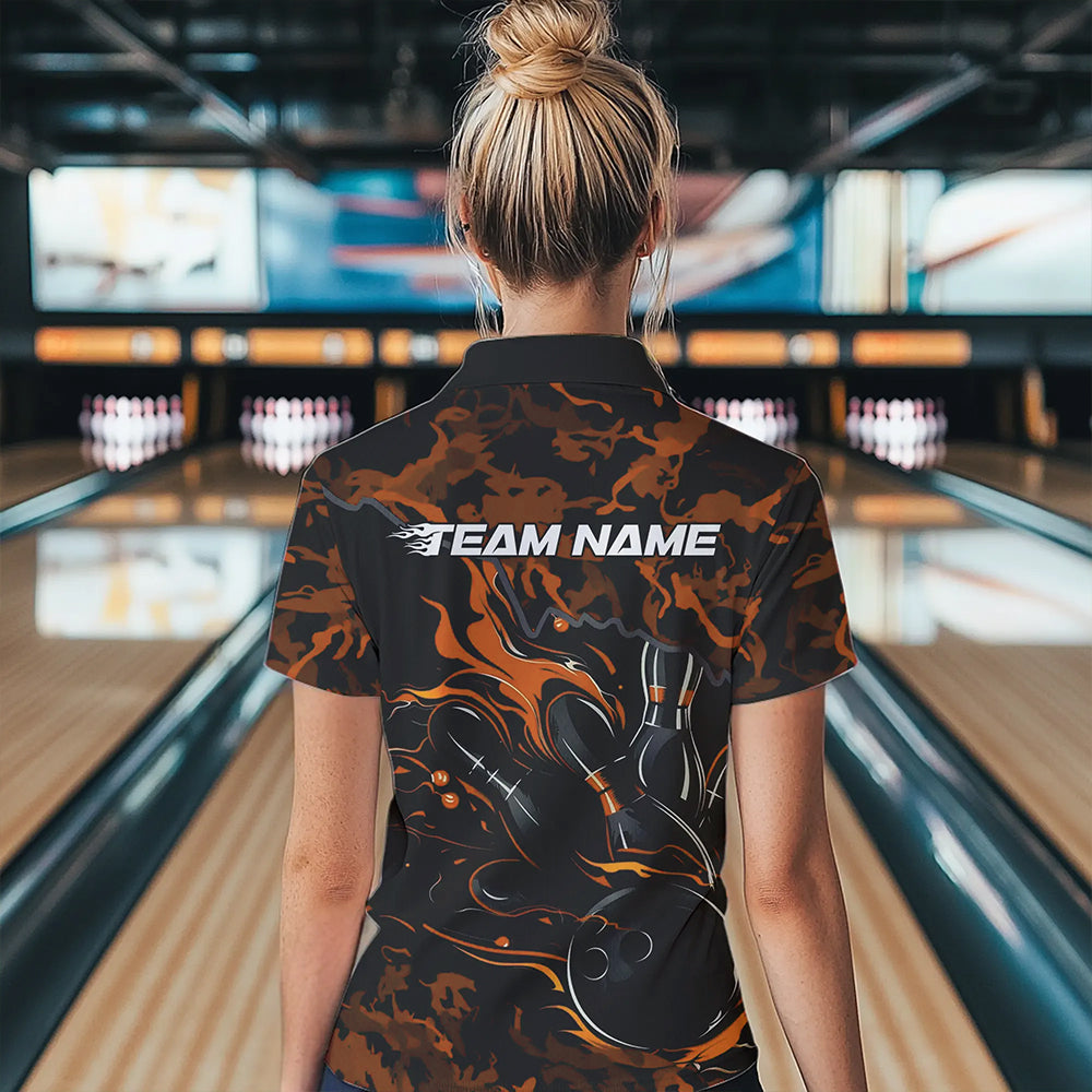Custom Black And Orange Camo Flame Bowling Womens Polo Shirts, Bowling Tournament Shirt IPHW8624