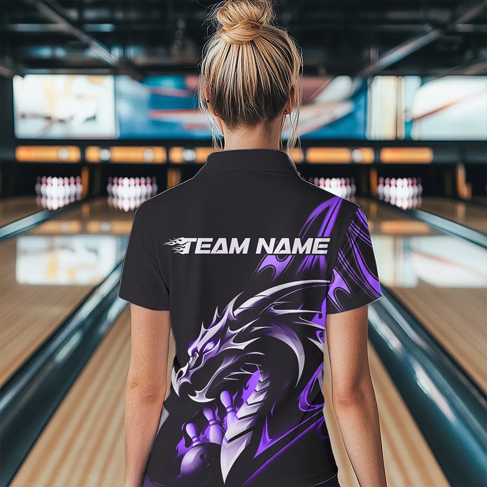 Custom Black And Purple Flame Dragon Bowling Womens Polo Shirt, Dragon Bowling League Shirt IPHW8704