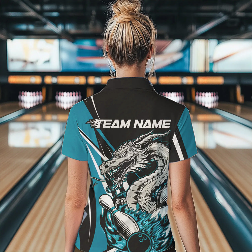 Custom Black And Blue Flame Dragon Bowling Jerseys, Dragon Women Bowling Team Polo Shirts IPHW8712