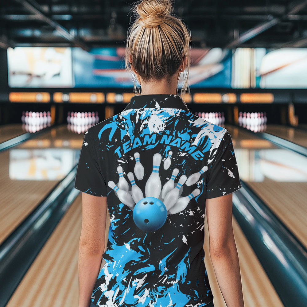 Black, Blue And White Custom Bowling Team Women Polo Shirts, Bowling Ball And Pin Jerseys IPHW8794