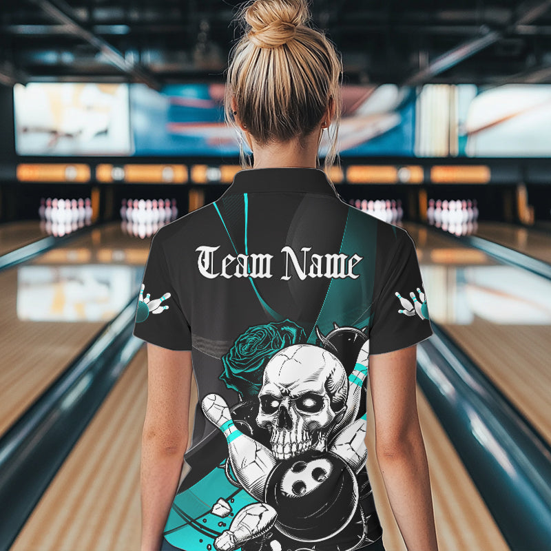Custom Black And Blue Roses Skull Bowling Team Polo Shirts For Women, Skull Bowling Jerseys IPHW8872