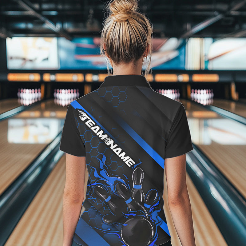 Custom Black And Blue Flame Duckpin Bowling Polo Shirt For Women, Bowling Team League Shirt IPHW8949