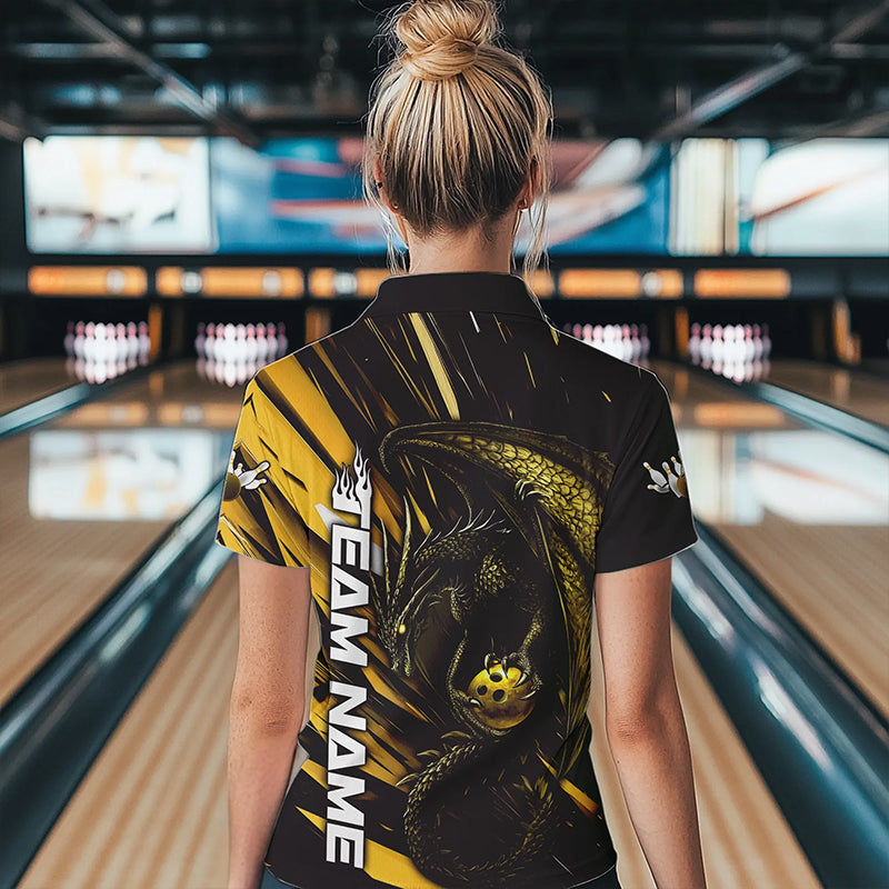 Black And Yellow Custom Dragon Bowling Team Polo Shirts For Women, Bowling League Shirt IPHW8967