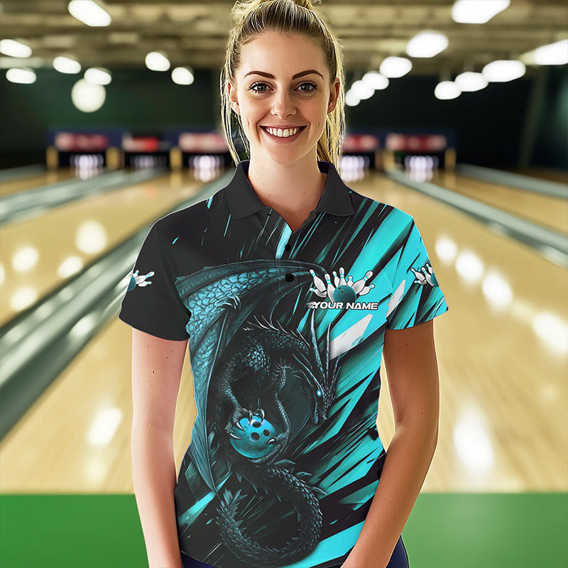 Black And Blue Custom Dragon Bowling Team Polo Shirts For Women, Bowling League Shirt IPHW8968