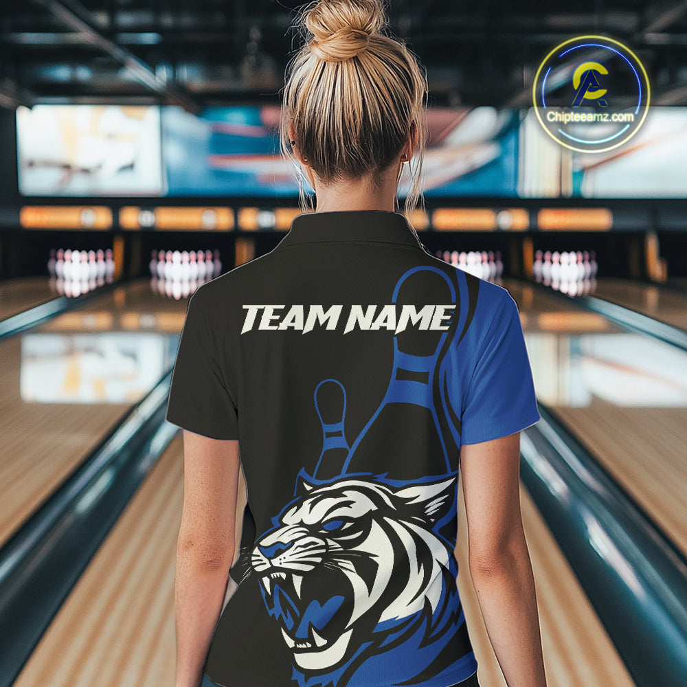 Custom Black And Blue Tiger Bowling Jerseys, Tiger Bowling Team Women Polo Shirts IPHW9015