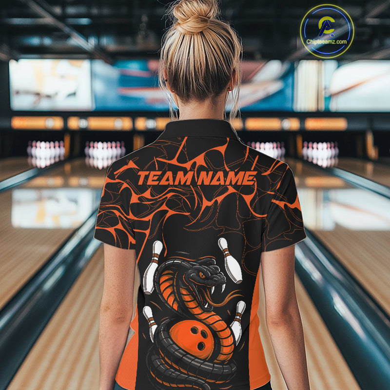 Custom Black And Orange Cobra Snake Bowling Jerseys, Bowling Team Women Polo Shirts IPHW9040
