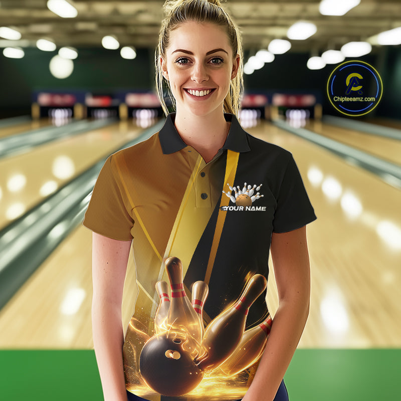 Custom Black And Glowing Gold Bowling Team Women Polo Shirts, Golden Bowling Jerseys IPHW9454
