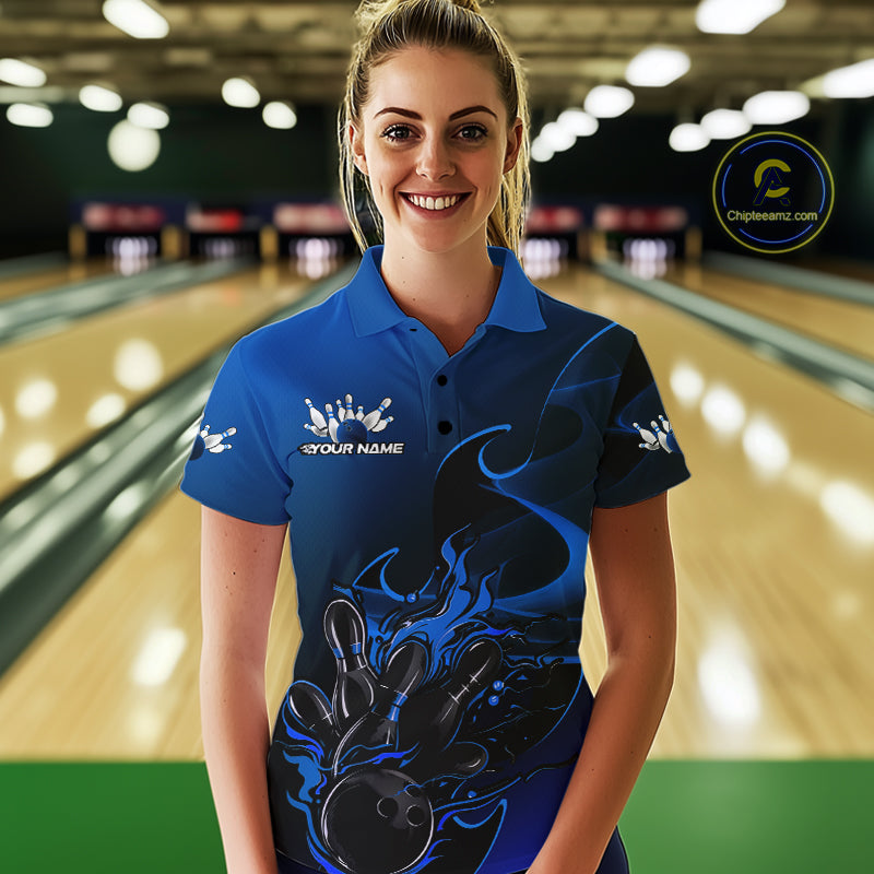 Custom Black And Blue Flame Bowling Team Women Polo Shirt, Bowling Tournament Shirt IPHW9871