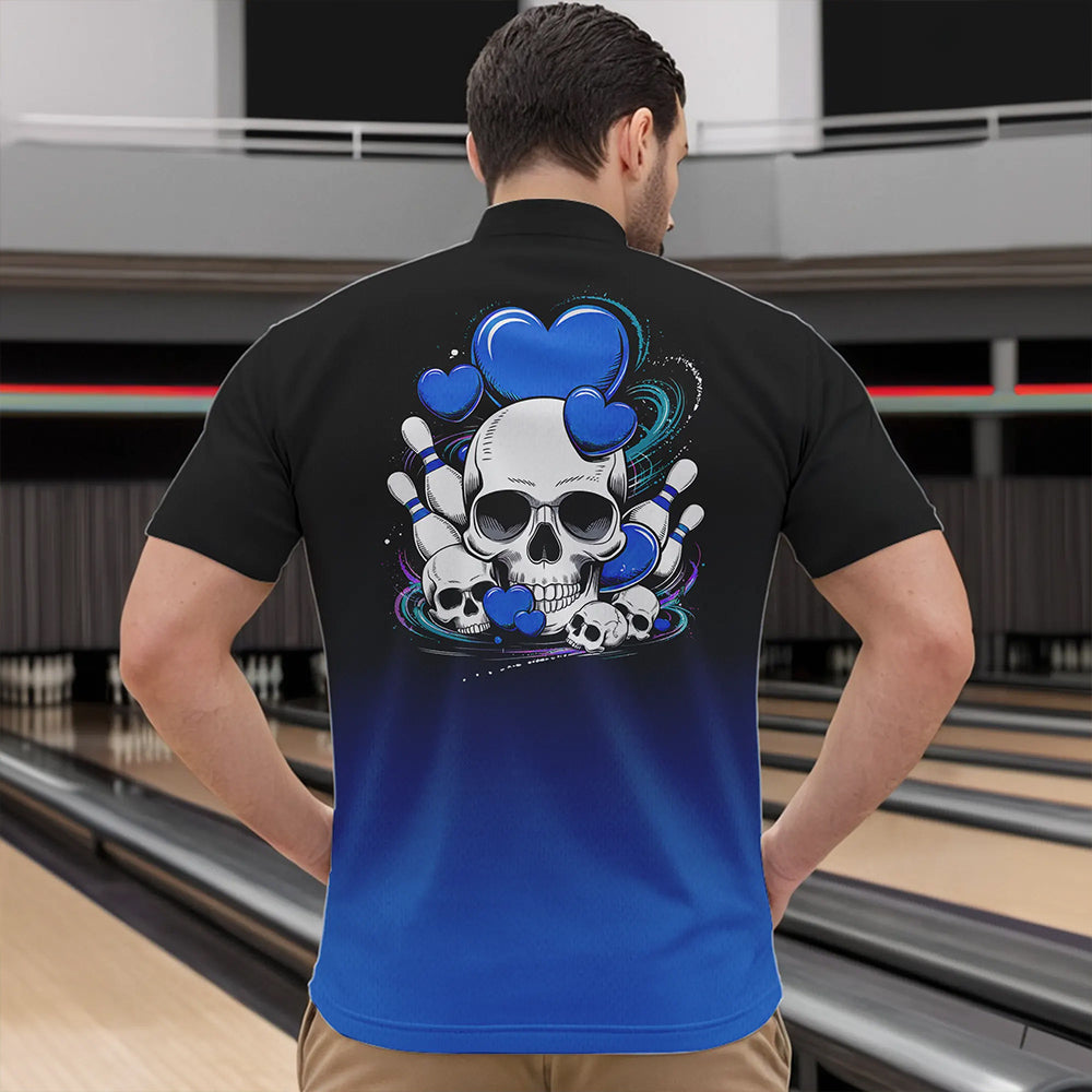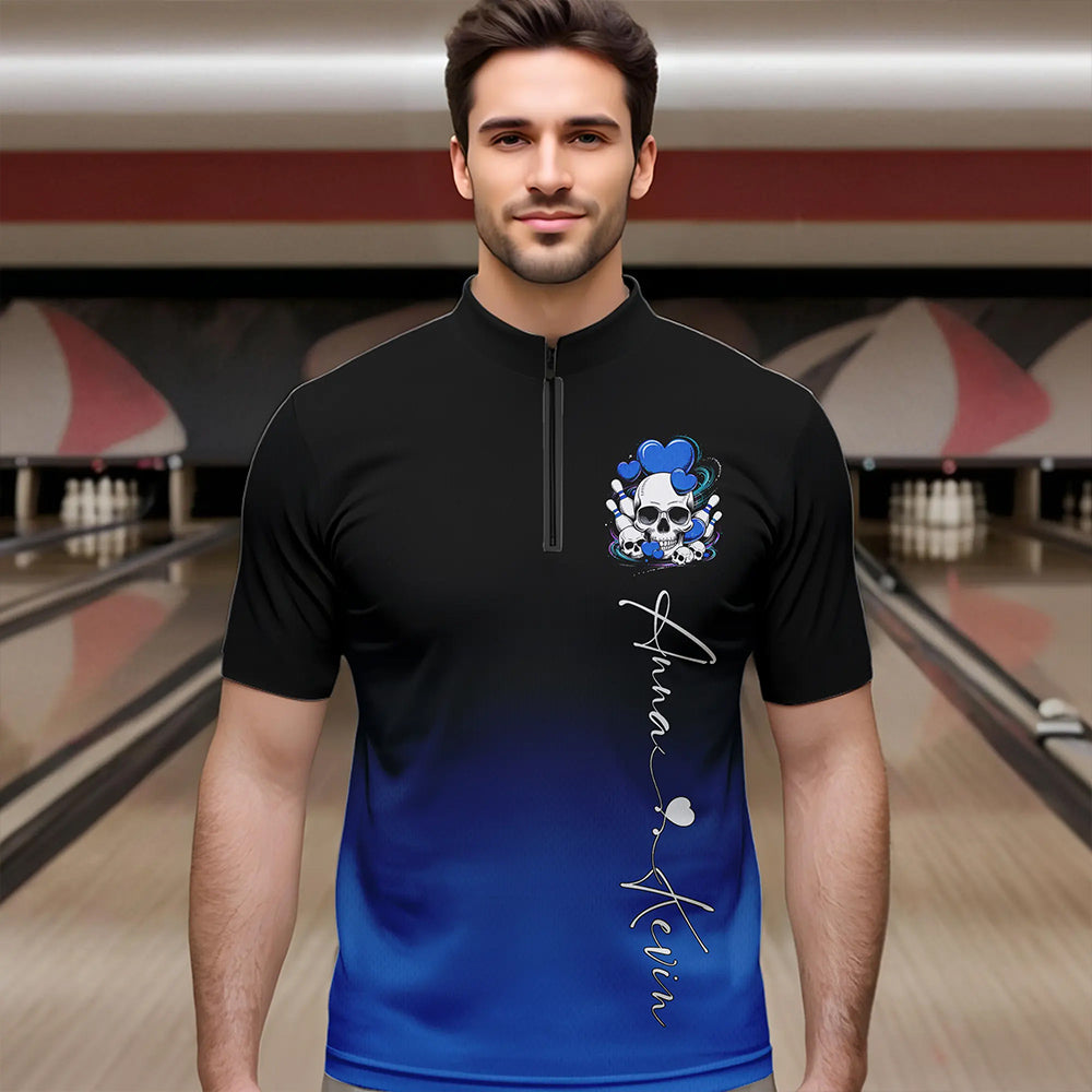 Custom Black And Blue Skull Valentines Day Couple Bowling Quarter-Zip Shirts For Men IPHW8343