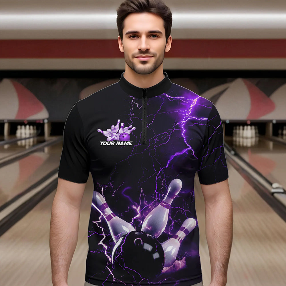Custom Black And Purple Thunder Lightning Bowling Tournament Quarter-Zip Shirts For Men IPHW8520