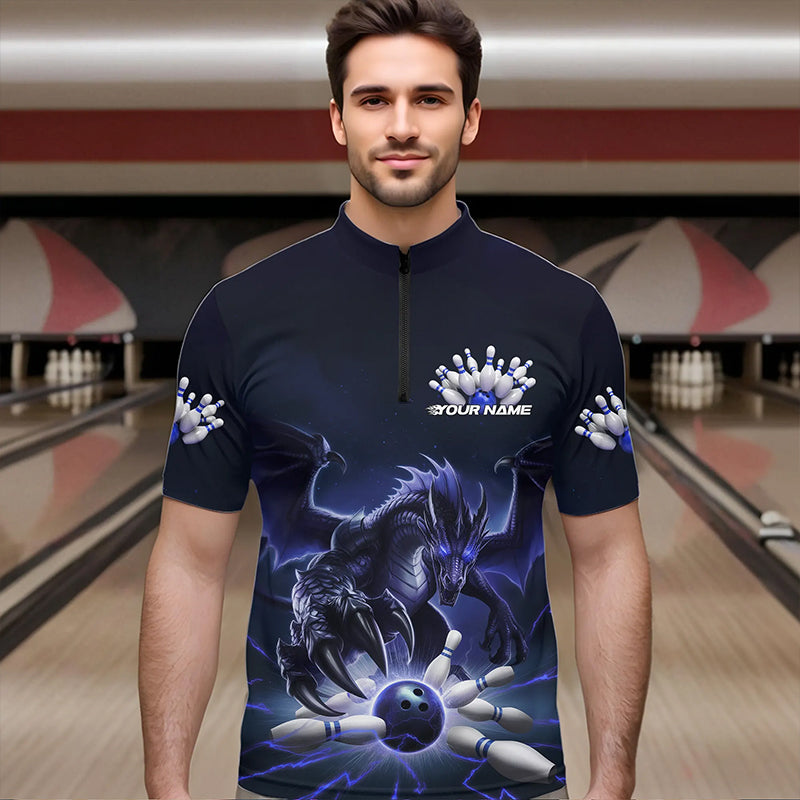 Custom Black And Blue Dragon Bowling Team Quarter-Zip Shirts For Men, Dragon Bowling League Shirt IPHW8550