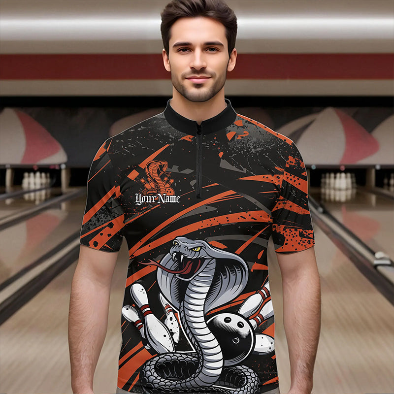 Custom Black And Orange Cobra Snake Bowling Team Quarter-Zip Shirts For Men, Bowling League Shirts IPHW8567