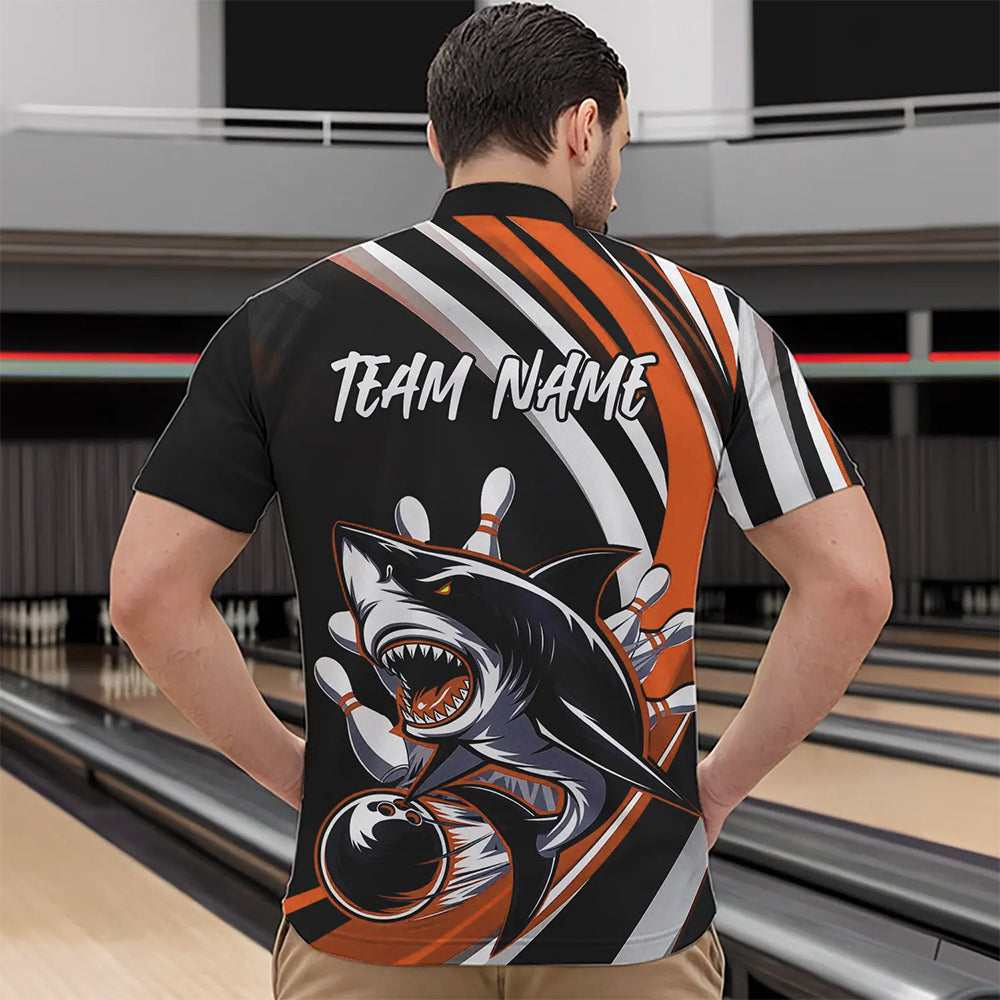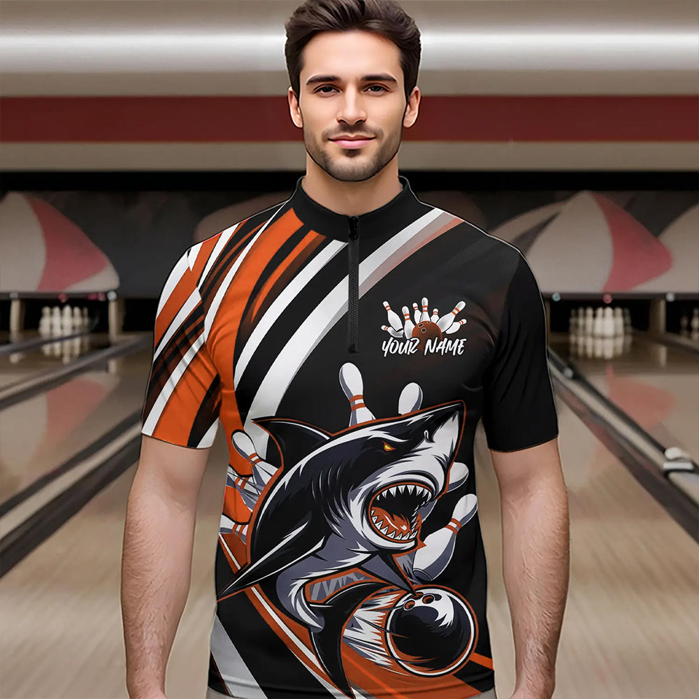 Custom Black And Orange Shark Bowling Quarter-Zip Shirts For Men,  Shark Bowling Team Jerseys IPHW8723