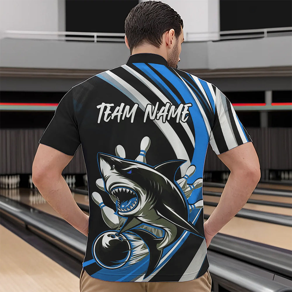 Custom Black And Blue Shark Bowling Quarter-Zip Shirts For Men,  Shark Bowling Team Jerseys IPHW8724