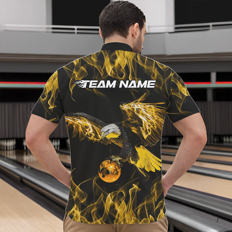 Custom Black And Gold Flame Eagle Bowling Team Men Quarter-Zip Shirts, Eagle Bowling League Shirt IPHW8801