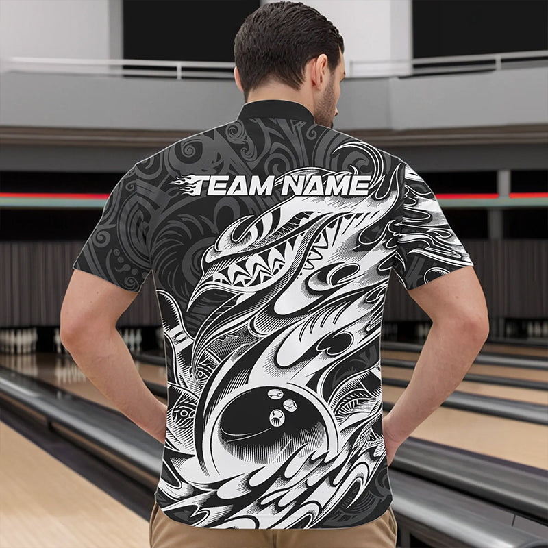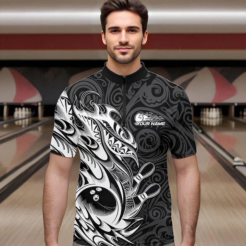 Custom Black And White Tribal Polynesian Bowling Team Men Quarter-Zip Shirts, Niho Mano Bowling IPHW8812