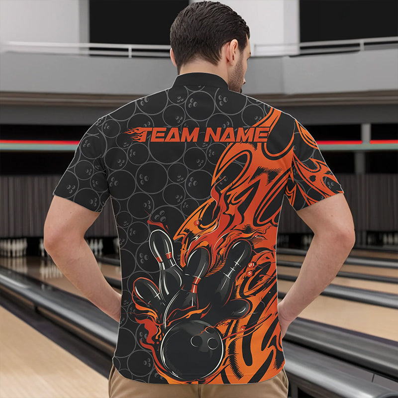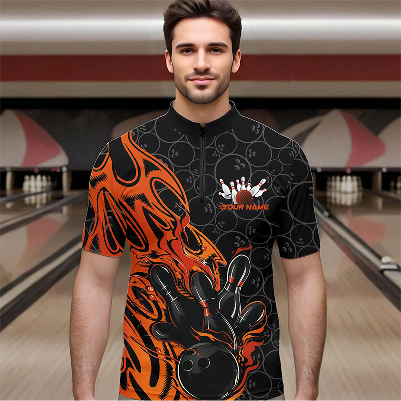 Custom Black And Orange Tribal Flame Bowling Team Men Quarter-Zip Shirts, Bowling Pattern Outfits IPHW8816