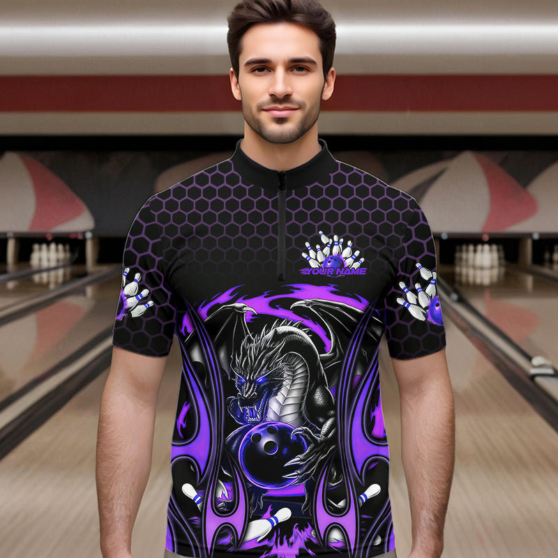 Custom Black And Purple Flame Dragon Bowling Men Quarter-Zip Shirts, Team Bowling League Shirt IPHW8840